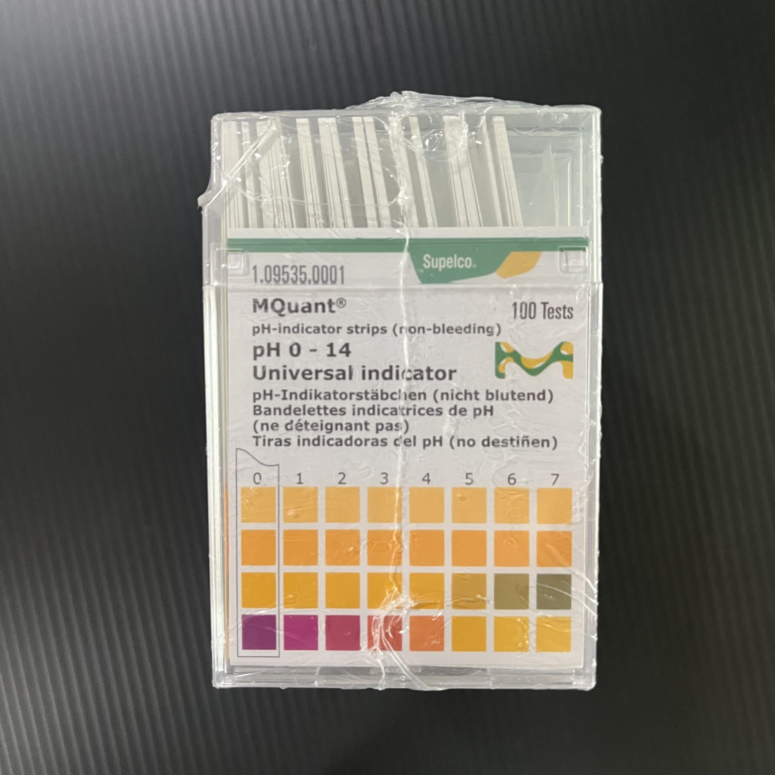 pH indicator strip pH 0-14 universal strip 100 ชิ้นต่อกล่อง ยี่ห้อ: Merck ———————————————————– pH indicator strip pH 0-14 universal strip 100 pcs./box Brand Merck